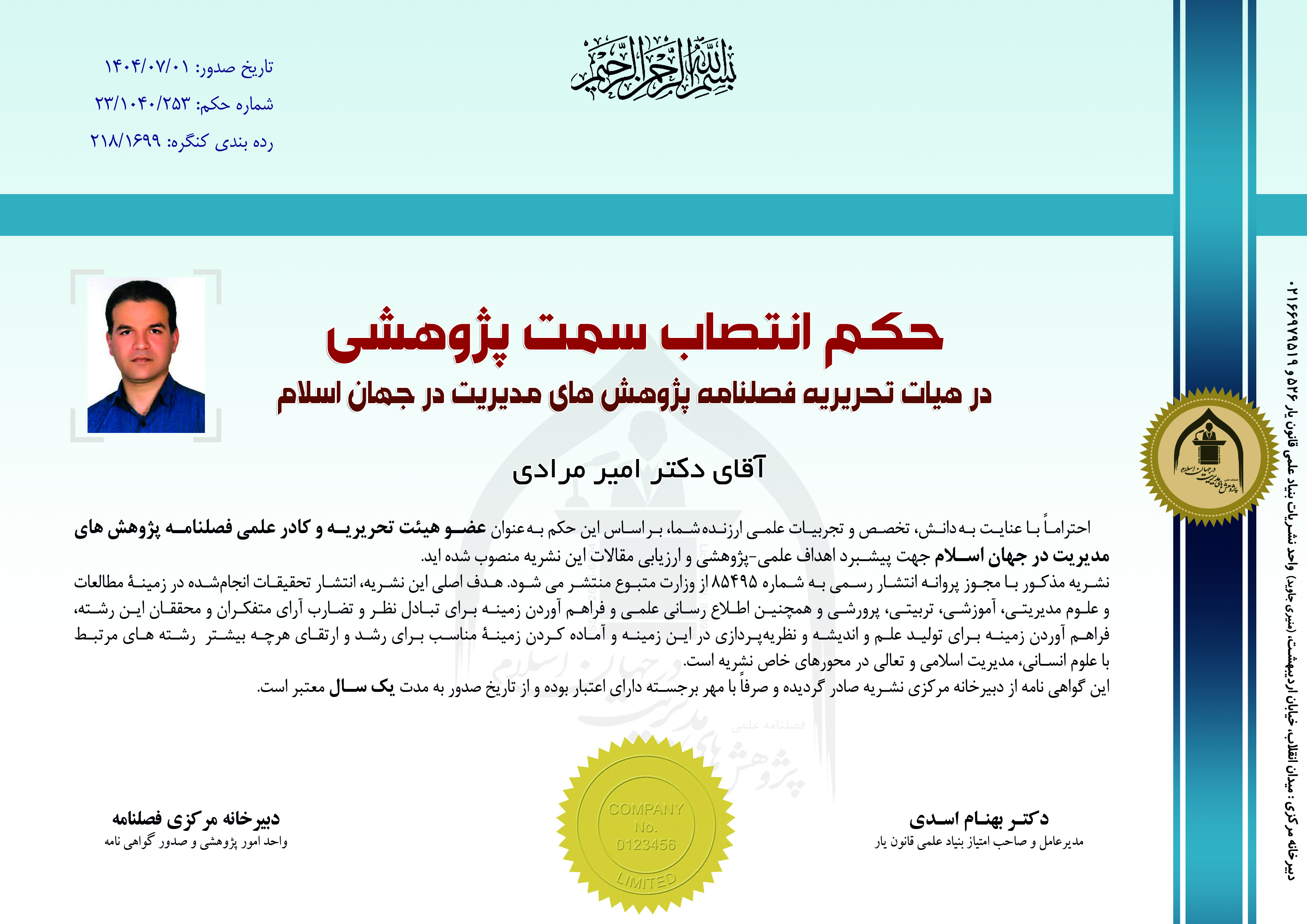 احتراماً با عنایت به دانش، تخصص و تجربیات علمی ارزنده شما، بر اساس این حکم به عنوان عضو هیئت تحریریه و کادر علمی فصلنامه پژوهش های مدیریت در جهان اسلام جهت پیشبرد اهداف علمی-پژوهشی و ارزیابی مقالات این نشریه منصوب شده اید.